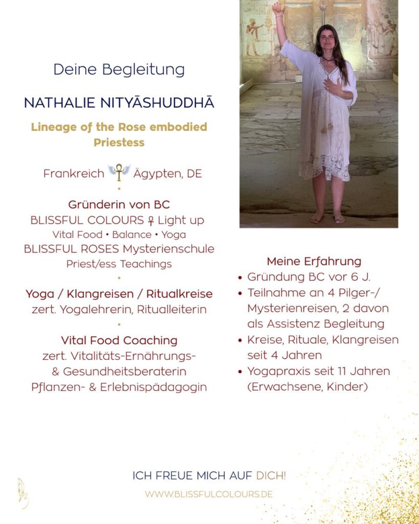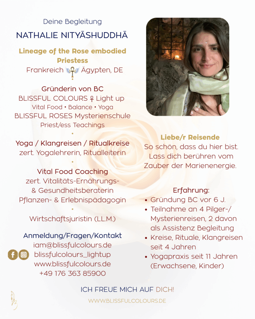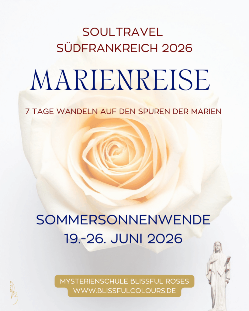 Im französischen Frühsommer reisen wir 7 Tage zu den heiligen Sommersonnenwende vom 19. Juni bis 26. Juni 2026 und entdecken einen Pfad voller Mystik um die Rosenlinie. Vielleicht bist du ihn schon einst gewandelt… zu anderen Zeiten, in fernen Landen. Vielleicht begegnest du dir auch neu. Sei bereit für eine Reise der Erinnerung deines reinen Selbst. Tief gehalten und begleitet von den Marien und mir.