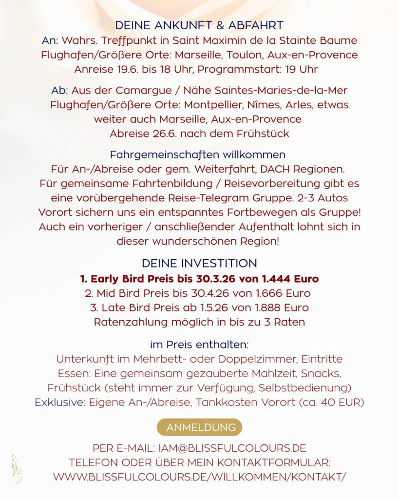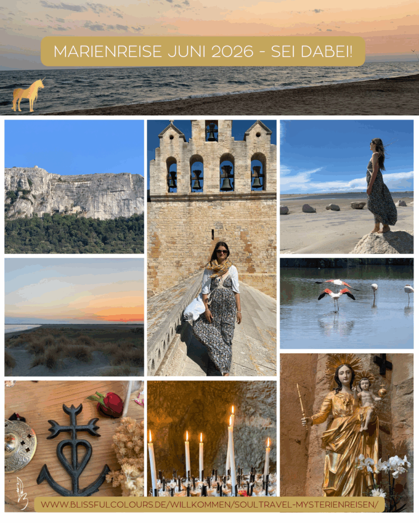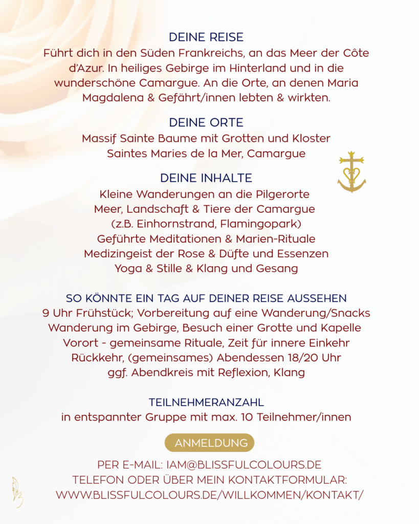 Die Reise führt dich in den Süden Frankreichs, in magische Wälder, weitläufige Strände, Flamingo Wasserfelder, heilige Orte und Höhlen & Grotten, in denen einst die Marien wandelten. Auf den Pfaden der Marien, Maria Magdalenas spürst du deine eigene Seelenessenz, dein ur-eigenes Sein. In heiliger Gemeinschaft von Gleichgesinnten in kleiner privater Gruppe. Eine ganz besondere Reise, die dich selbst auffordert, deinen Weg zu gehen, mit deinen Schritten und deinem Herzen ♡ in Verbindung, in Liebe.