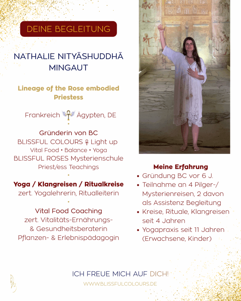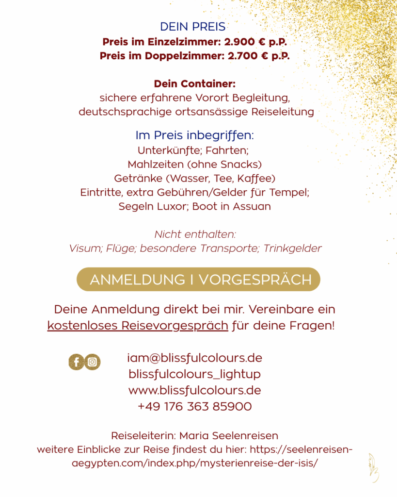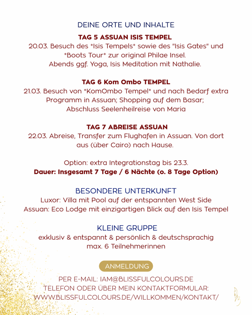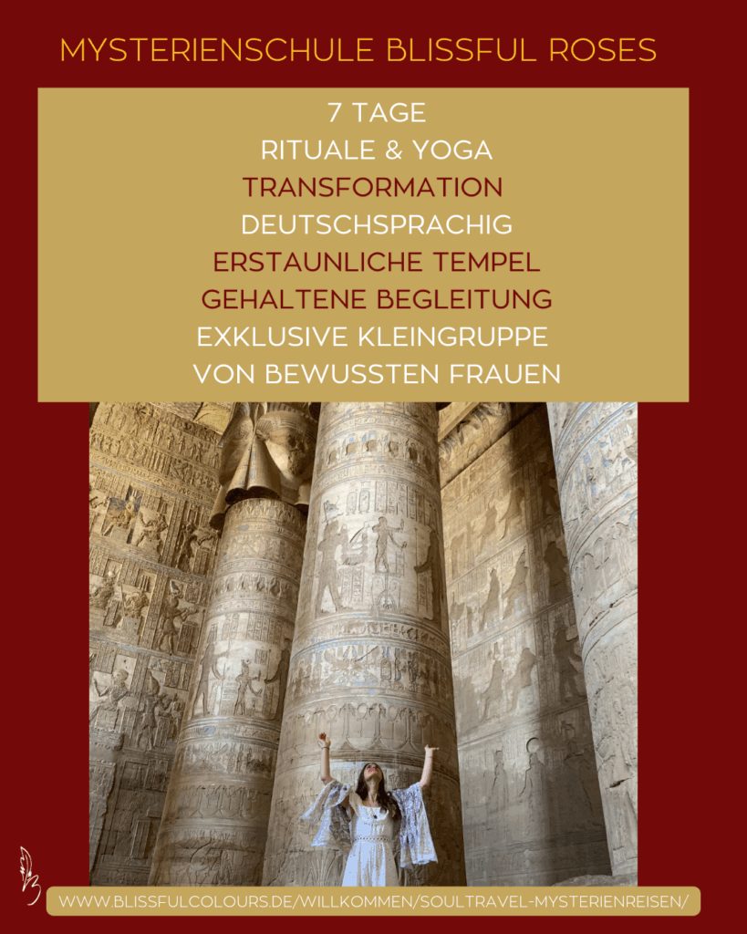 Lass dich verzaubern vom Charme der großen Tempel, von massiven Säulen und Bauten, vom Schweben über den Nil beim Segeln, vom Spirit der Gemeinschaft von Frauen, die ihren Weg gehen. Der Ruf der kosmischen Mutter bewegt etwas in dir, was nicht mit Worten zu beschrieben ist. Zu erleben bist du geboren und gekommen, hier und jetzt in deinem Leben. Danke dir dafür – jeden Tag. Ich danke dir, für dein JA zum JETZT.