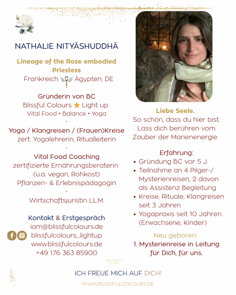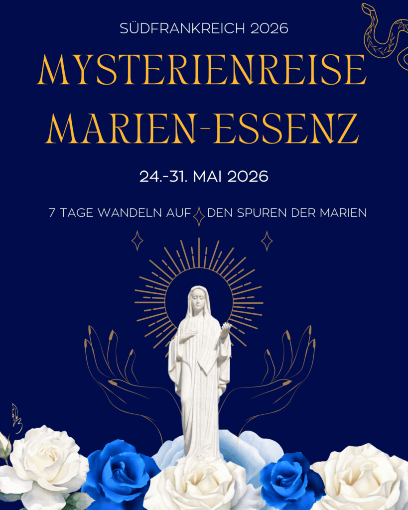 Im milden französischen Frühsommer reisen wir 7 Tage zu den heiligen Pfingsttagen vom 24. Mai bis 31. Mai 2026 und entdecken einen Pfad voller Mystik um die Rosenlinie. Vielleicht bist du ihn schon einst gewandelt… zu anderen Zeiten, in fernen Landen. Vielleicht begegnest du dir auch neu. Sei bereit für eine Reise der Erinnerung deines reinen Selbst. Tief gehalten und begleitet von den Marien und mir.