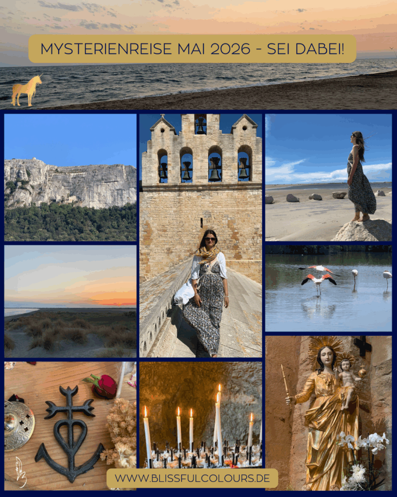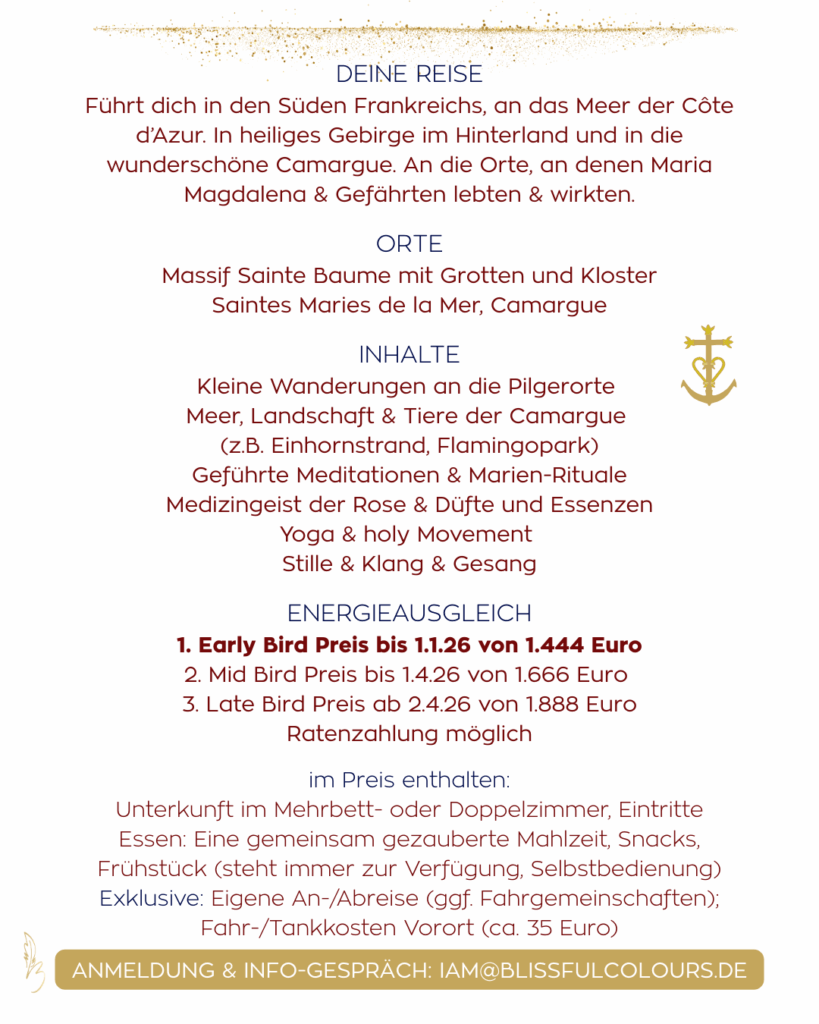 Die Reise führt dich in den Süden Frankreichs, in magische Wälder, weitläufige Strände, Flamingo Wasserfelder, heilige Orte und Höhlen & Grotten, in denen einst die Marien wandelten. Auf den Pfaden der Marien, Maria Magdalenas spürst du deine eigene Seelenessenz, dein ur-eigenes Sein. In heiliger Gemeinschaft von Gleichgesinnten in kleiner privater Gruppe. Eine ganz besondere Reise, die dich selbst auffordert, deinen Weg zu gehen, mit deinen Schritten und deinem Herzen ♡ in Verbindung, in Liebe.