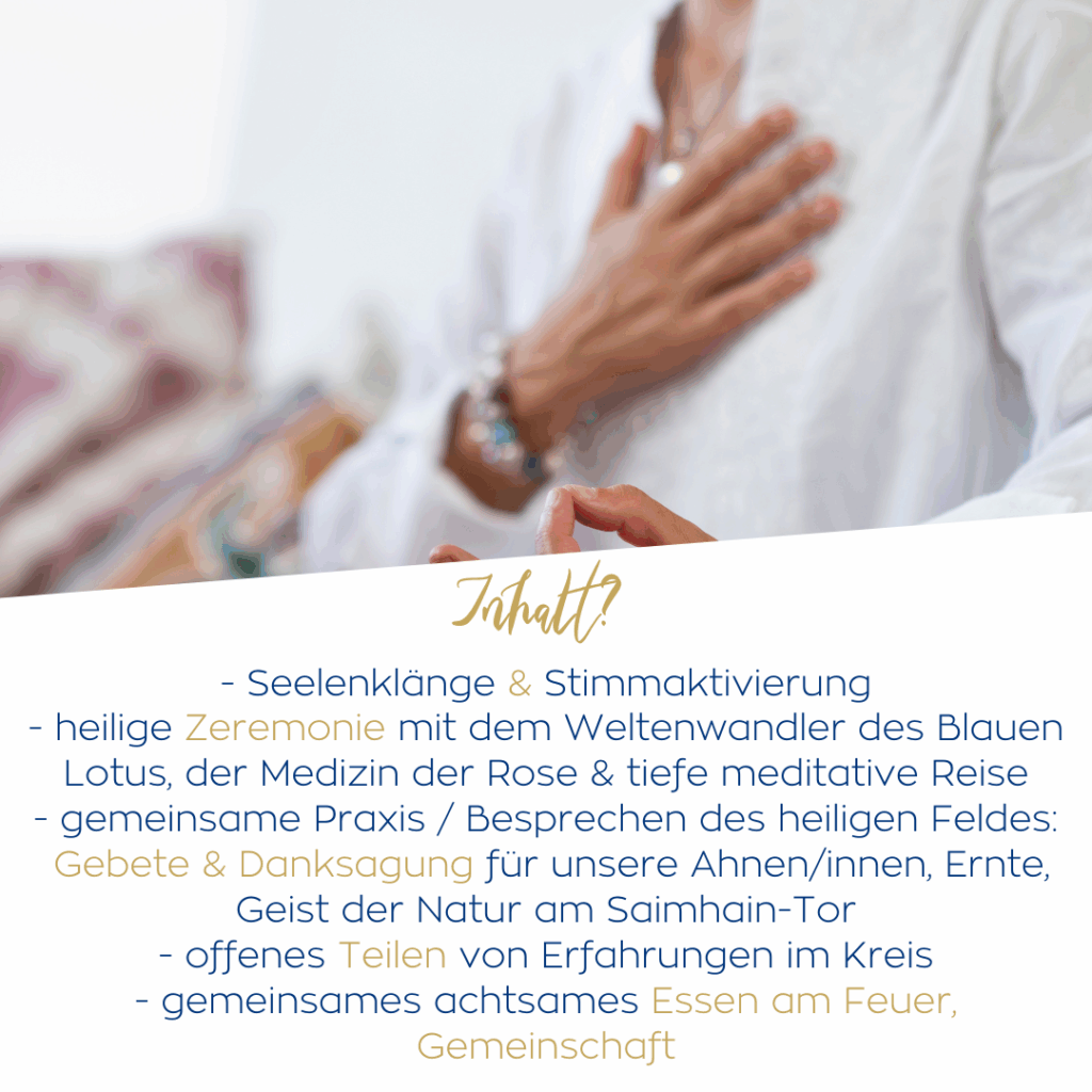 Ich begleiten dich in einen Raum der Selbsterfahrung in tiefer Meditation und gehaltener Gemeinschaft. Wir kreieren gemeinsam ein Feld der SELBST-Wahrnehmung mit der Kraft der Stimme, des Feuers und des Übergangs zu Samhain. Der Pflanzengeist des Übergangsbegleiters des Blauen Lotus & die Medizin der Rose führen dich in die Tiefe deiner Seele und lassen den Schleier der Illusion der Trennung verschwimmen, um dich GANZ wahrzunehmen. Was ist es, was du selbst erfahren möchtest?